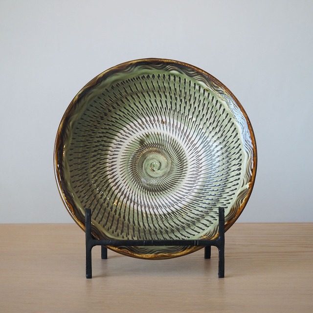 黄味掛かった優しい緑に、小代焼らしく流し掛けられた釉薬が美しい5寸皿。 少し深さもあり、取り皿やおやつ皿などとして使い勝手が良さそうです。 この絶妙な色合いは、ガス窯で還元焼成(酸素の供給が少ない状態で焼くこと)で焼かないと出せない色。 中平窯ではガス窯と登り窯を使い分けることで、小代焼の伝統の釉薬を使いながらも多彩な色を表現しています。 サイズ:約φ15.0cm×H3.5cm カテゴリ:陶器 産地:熊本県荒尾市 小代焼は江戸時代に細川家の御用窯として栄え、当時は基本的に肥後藩の中で流通していました。 鉄分の多い小代粘土と藁灰や木灰などを使った釉薬による流し掛けの技法が特徴で、素朴ながら力強く、味わい深いのがその魅力。 他藩との交流が少なかったことで、さほど変わらないままに現代に受け継がれました。 明治以降、藩の庇護がなくなったことで一時は衰退しますが、昭和初期に再興の動きがあり、2025年現在11軒の窯元が小代焼を名乗っています。 中平窯(なかでらがま)は1991年、西川講生さんにより開窯された小代焼の窯元。 今は息子の智成さんと親子二代で小代焼に取り組んでいます。 講生さんは今は途絶えてしまった一勝地焼(熊本)、それから小代焼ふもと窯での修業を経て独立。 一方の息子の智成さんは幼少期から父親の仕事を間近に見て育ち、根っからの焼きものマニア。 登り窯を焚く頻度を増やしたいと制作に意欲的で、今後が楽しみでなりません。 ※手仕事の品ですのでサイズはおおよそで、同じ形でも個体差があります。作りの粗い部分があることもご了承下さい。 ※実物に近いように撮影しておりますが、画像と色が若干違って見える場合もございます。ご理解の上ご購入下さい。 ※陶器は電子レンジ・食洗機ともにお使い頂けますが、長くお使いになりたければ控えめがおすすめです。また、食洗機は置き方や設定によっては欠けやすいのでご注意ください。 ※陶器のご使用前には目止めをされることをおすすめします。 ※環境への配慮からエコ包装を心掛けております。ご理解ご了承下さい。 ※2~3日中に出荷します。時間帯のご指定のみ可能です。お急ぎでなければお日にちのご指定も承りますので、ご希望の際はご記入下さい。