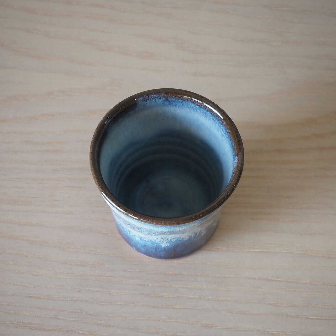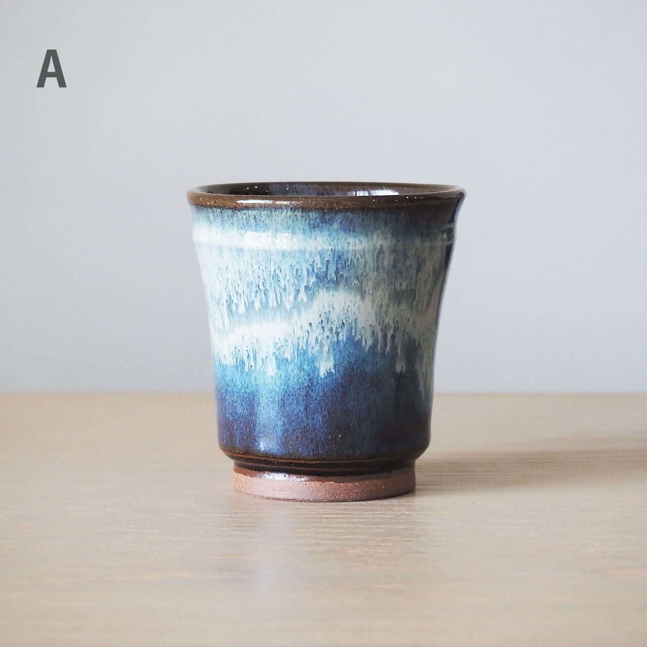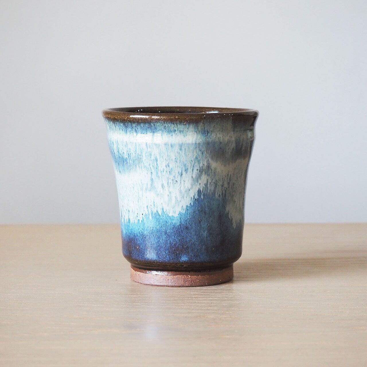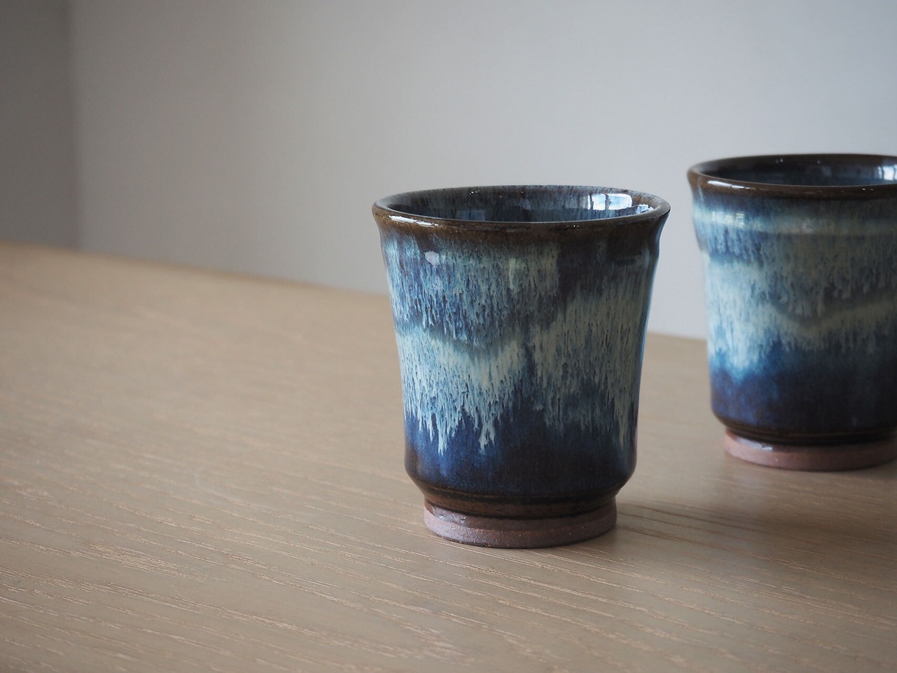 無造作に流れる釉薬がこれぞ小代焼、といった風情の青が美しいフリーカップ。