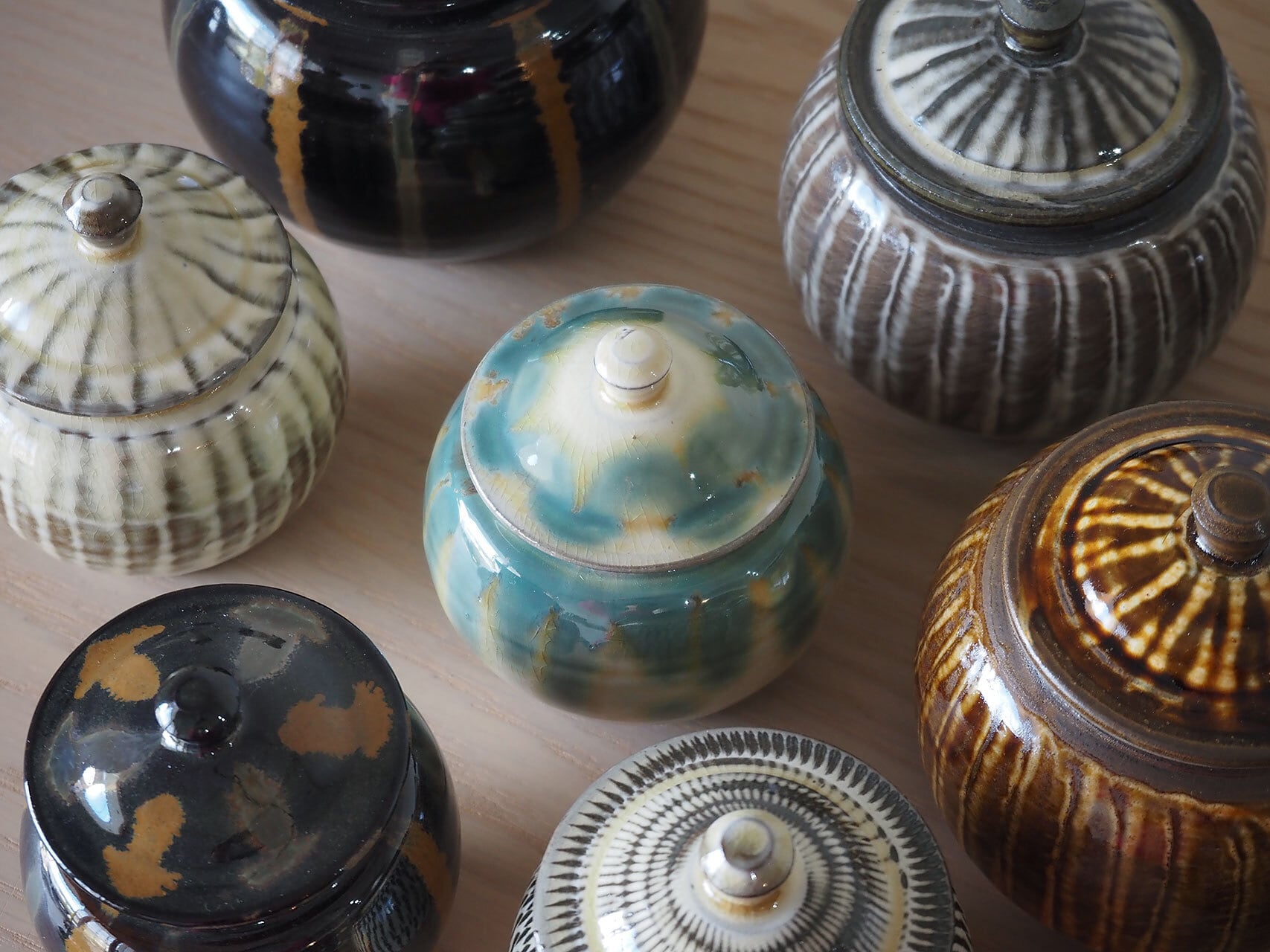 小鹿田焼 黒木昌伸窯 1合壺(黒/黄青流し)