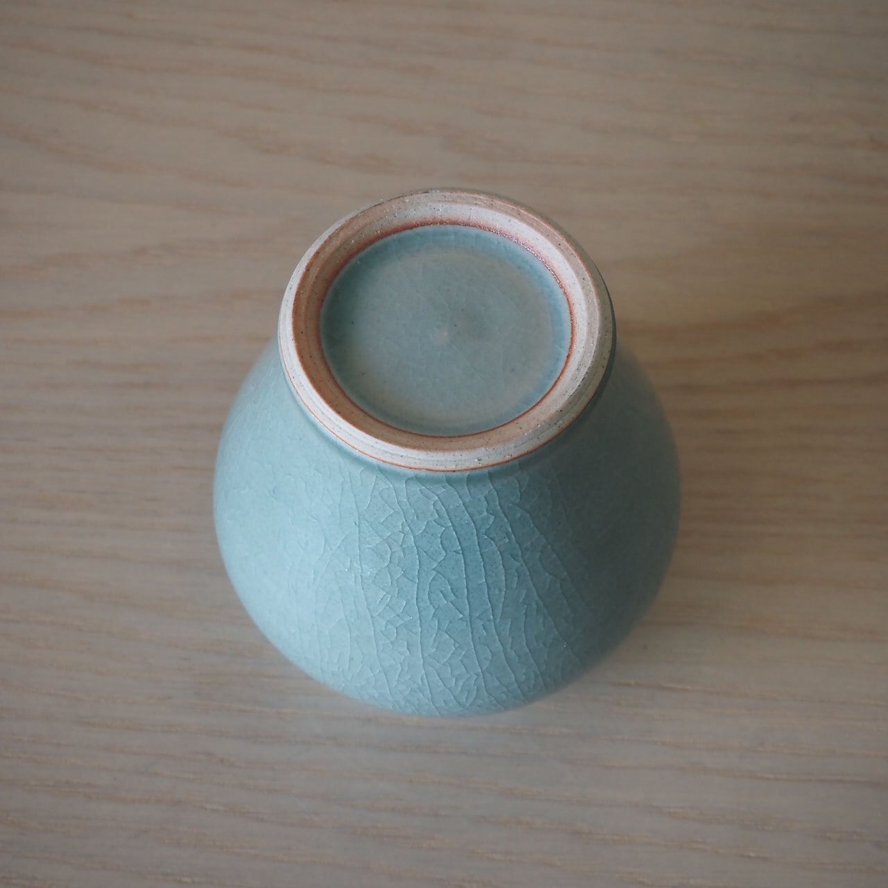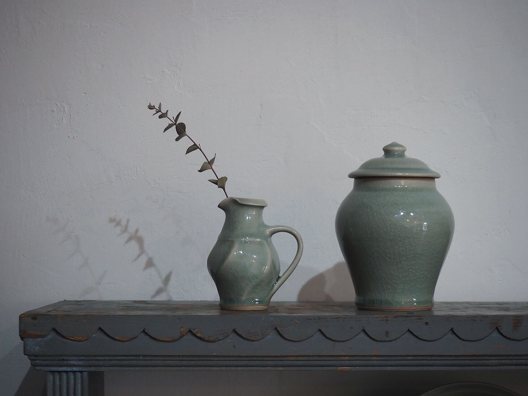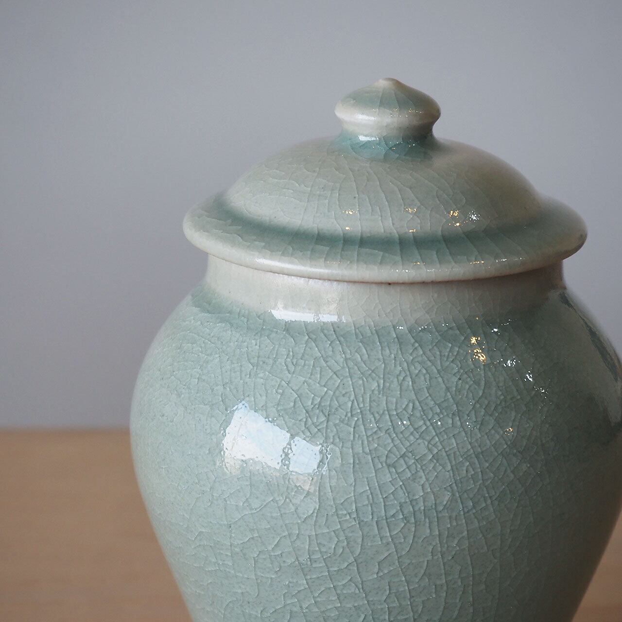 風見窯らしい青磁釉に、丸みのある形が美しい壺。
