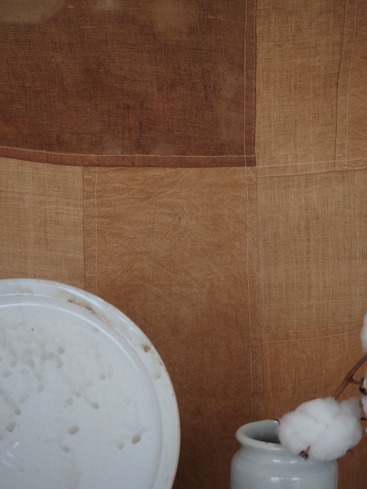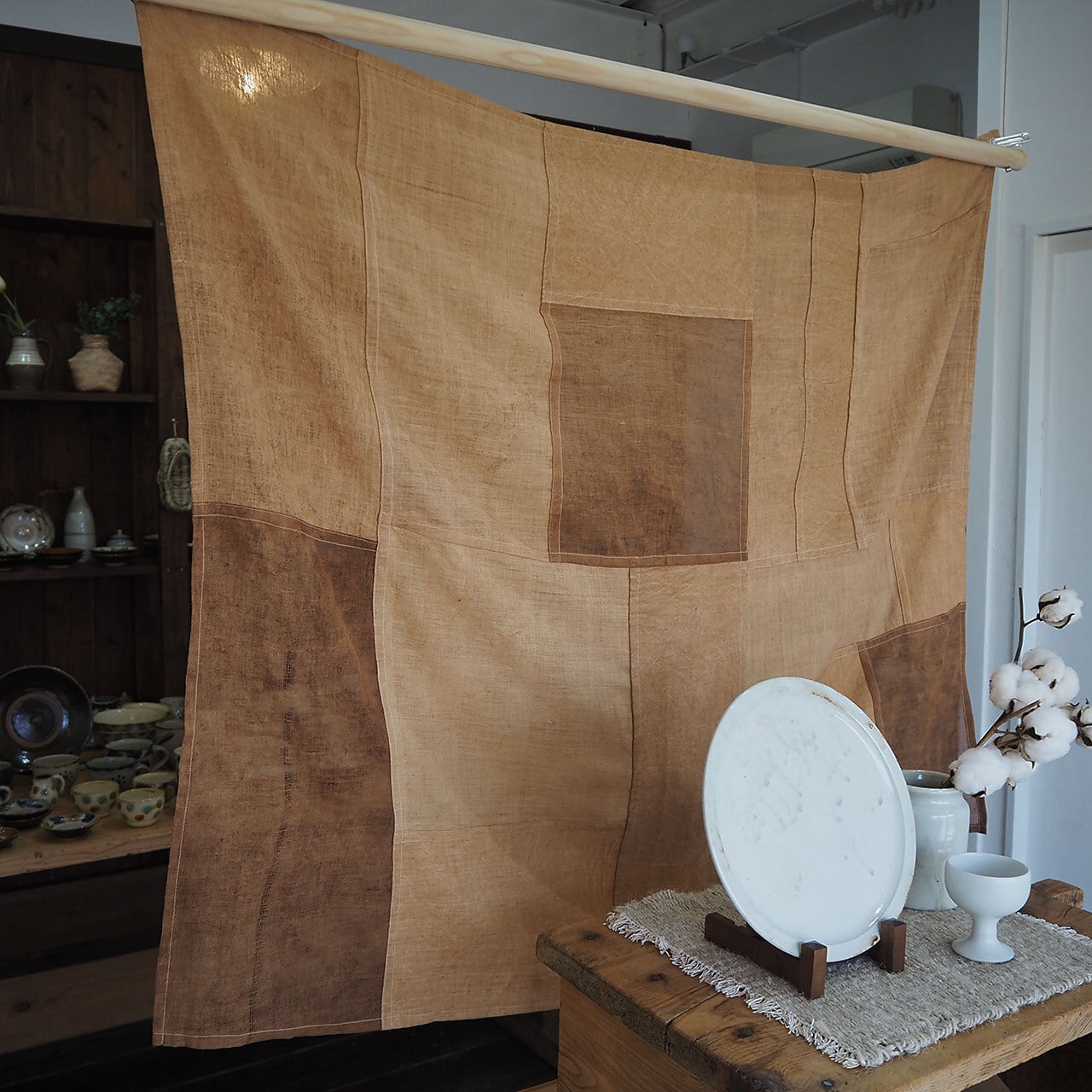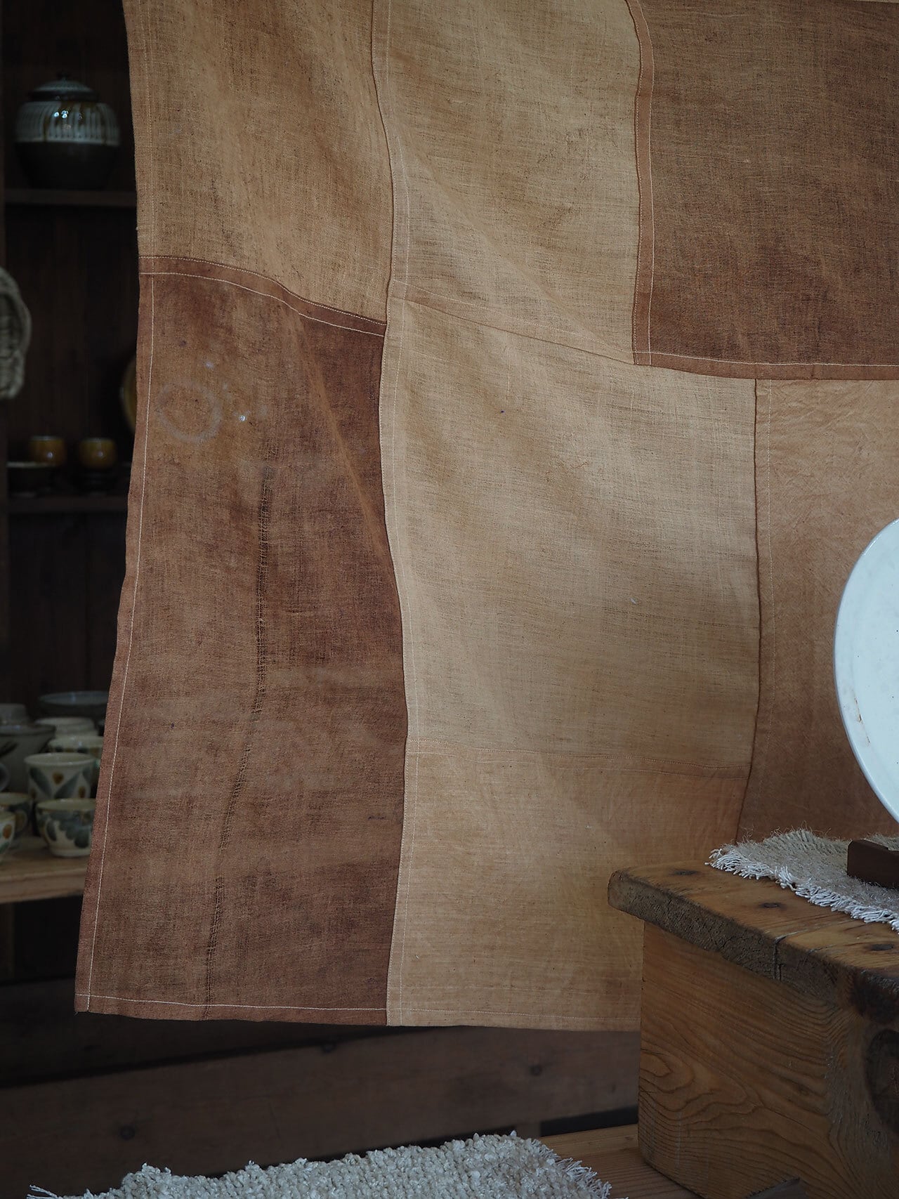 表情豊かないろいろな素材(インドの手紡ぎ手織りの布カディや、自然素材の古い布)を柿渋で染め、つぎはぎして作った大判の布。