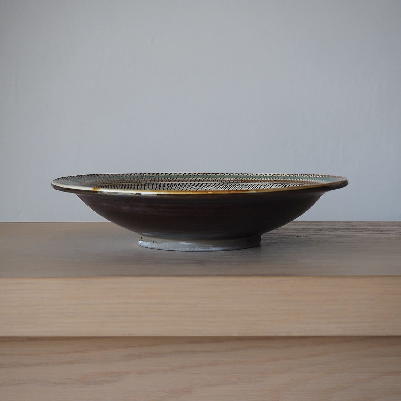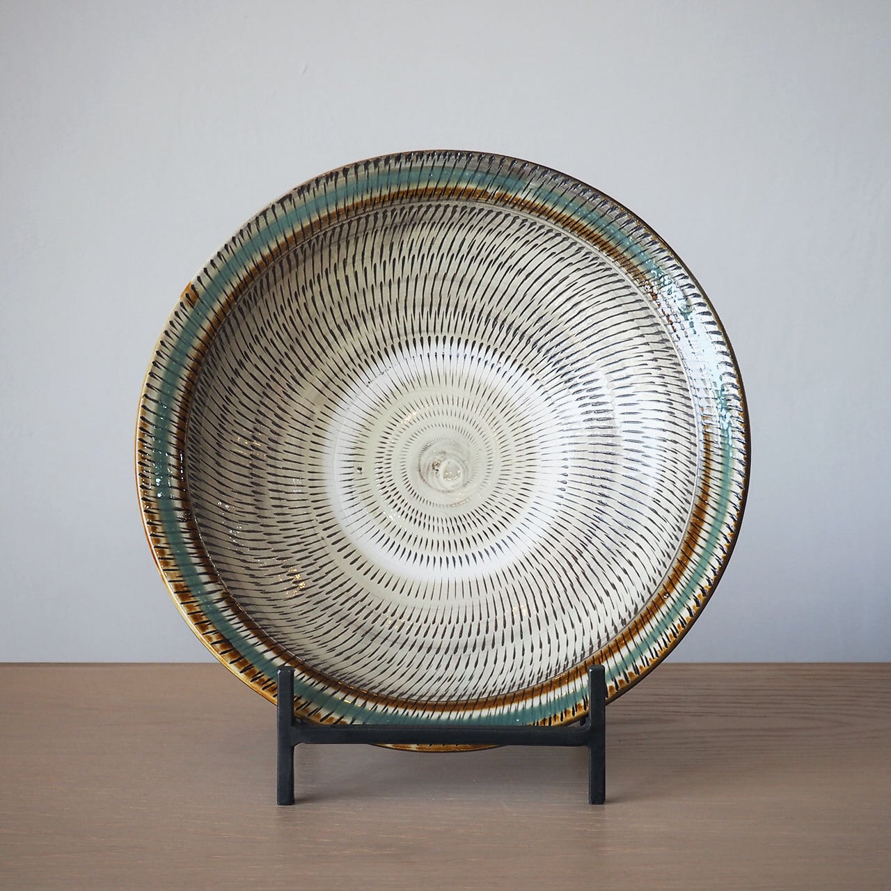 小鹿田焼 黒木昌伸窯 尺皿(白/飛び鉋に三彩線巻)