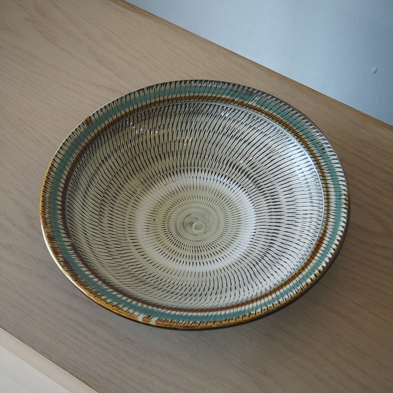 小鹿田らしい飛び鉋と、縁に巻かれた飴と緑が良い雰囲気です。