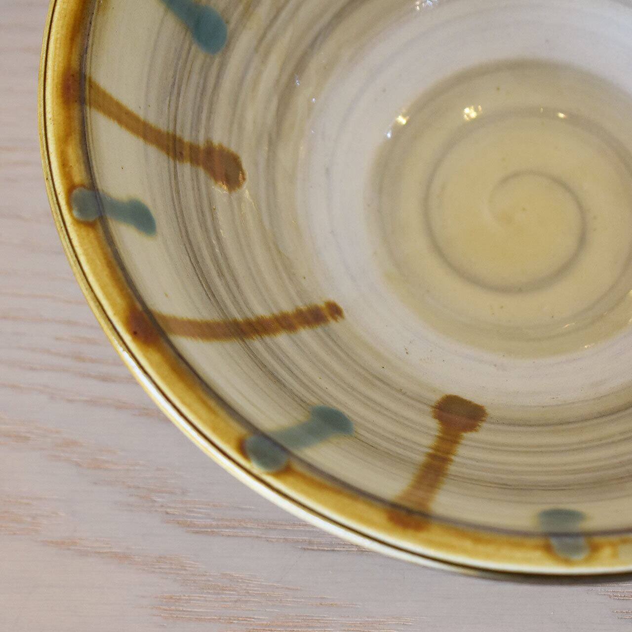 やわらかな白化粧に三彩釉が滲む味わい深い7寸鉢。