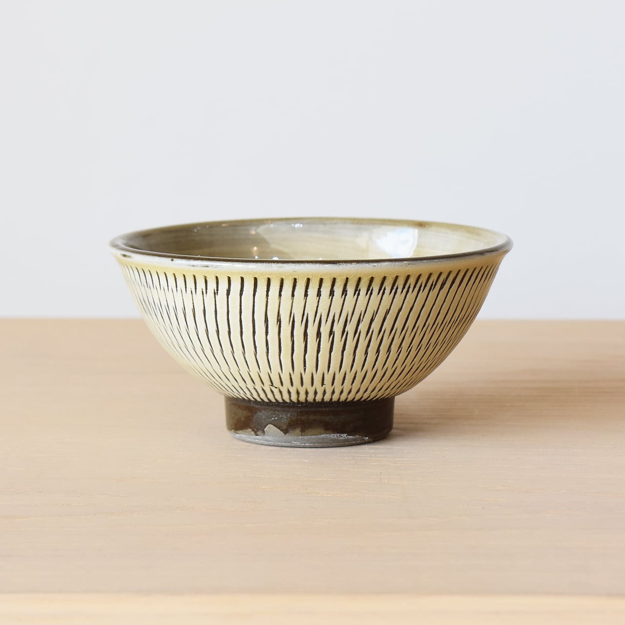 小鹿田らしいリズミカルな飛び鉋が施されたシンプルな4寸飯碗。
