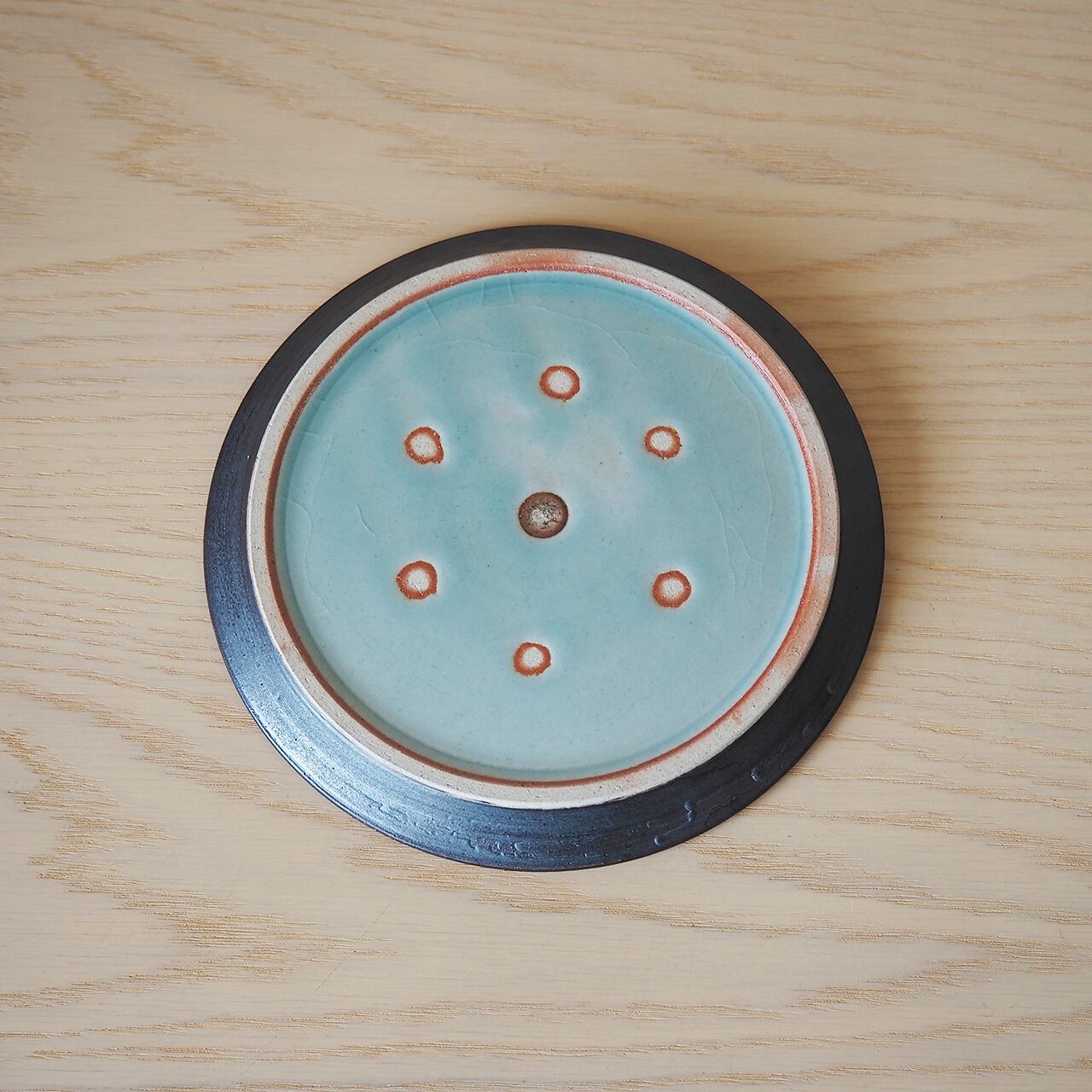鉄釉を施した縁と平たい形状が、モダンな印象を与えます。