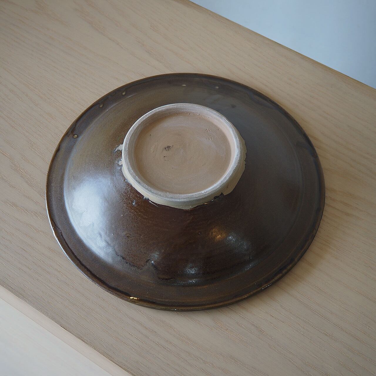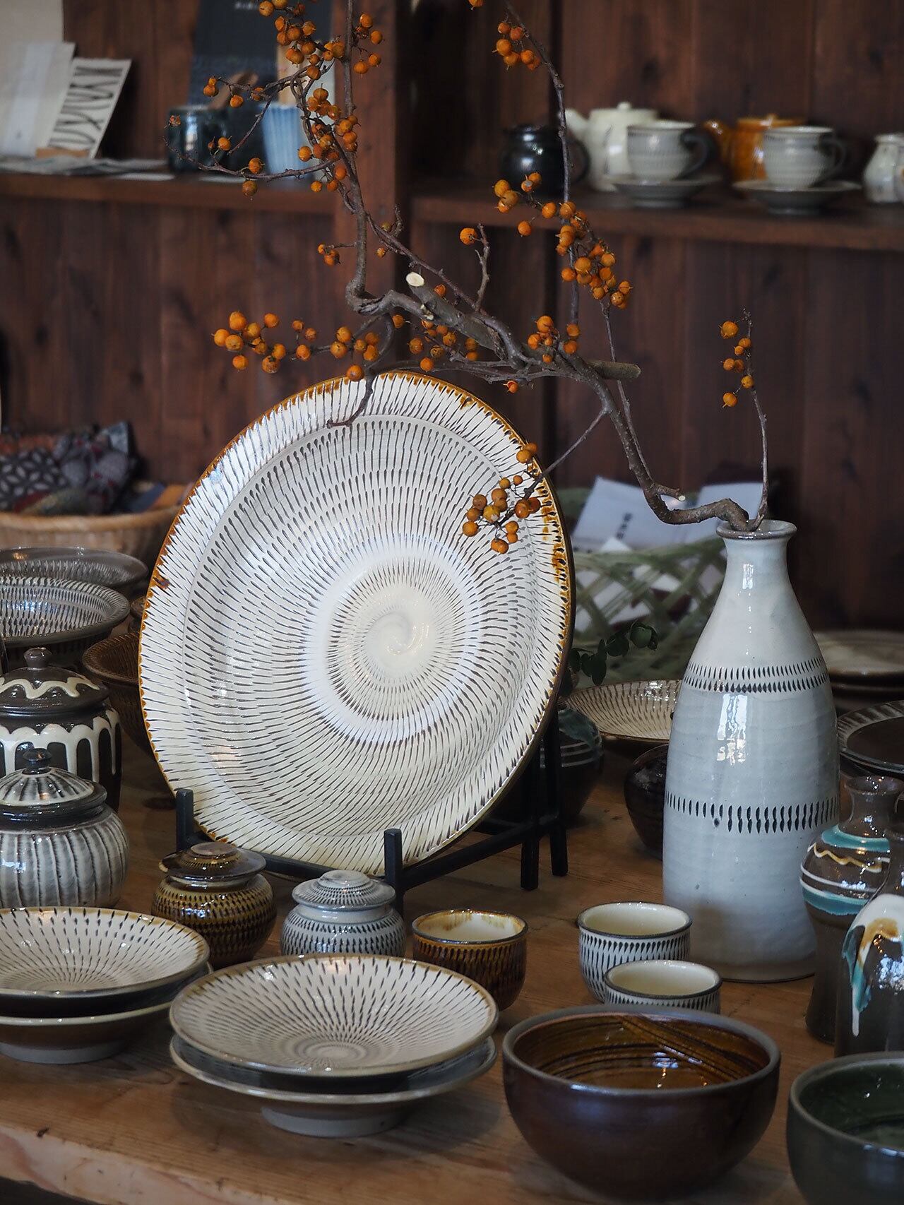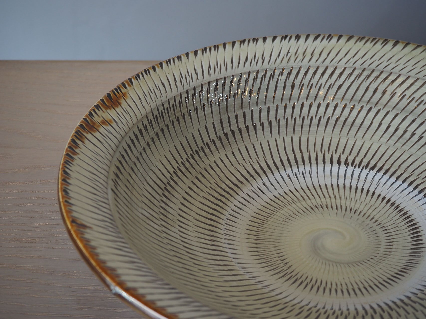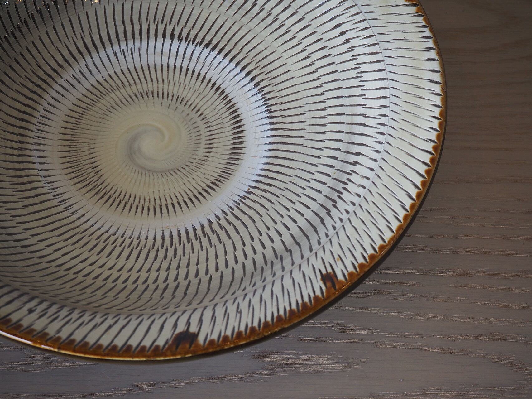 堂々として存在感のある尺皿。小鹿田らしい飛び鉋が生き生きとしています。